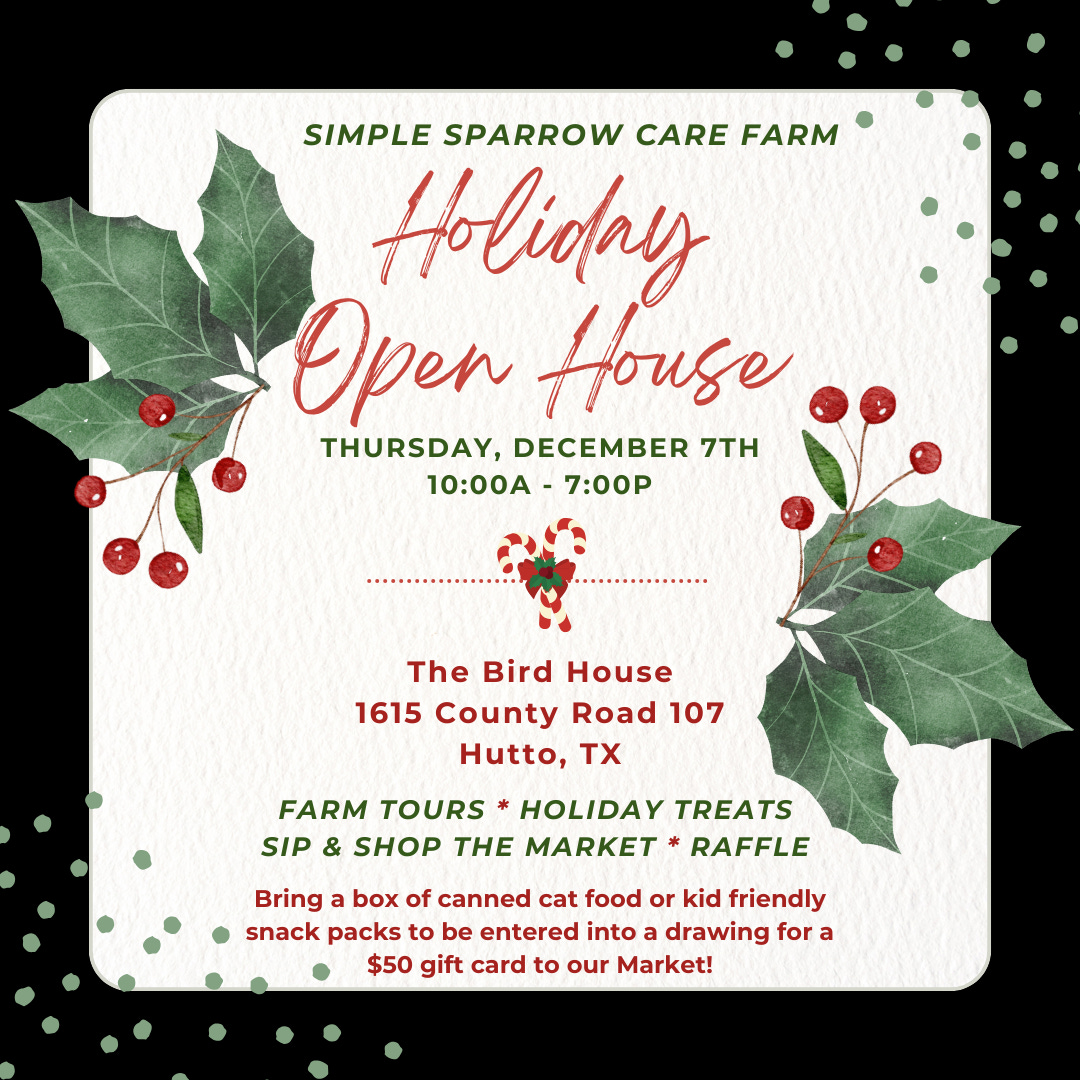 We’d love to celebrate with you! Feel free to bring a friend who might be interested in learning more about Simple Sparrow. Also, donate a box of canned cat food or a snack item and you will be entered into a drawing for a $50 gift certificate to spend in our market - just in time for the holidays! (Food items help us provide snacks for clients throughout the week. Suggestions include fruit/grain bars, granola bars, individual snack bags of Goldfish crackers, mixed nuts, popcorn, fruit snacks, etc.)